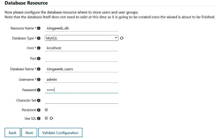 Step 15: In order to ensure that Icinga 2 connects to the MySQL database, fill in the necessary details as follows: