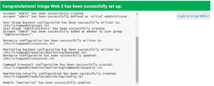 On clicking Next, the window shown in Figure 11 will confirm the successful installation of Icinga 2 and Icinga Web 2 on Ubuntu 17.10.