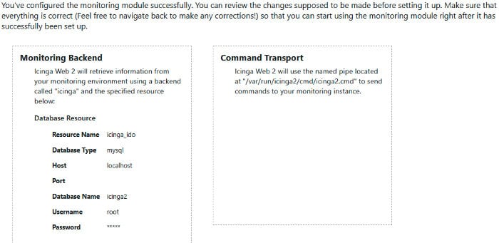 Step 20: After making all the above settings, Icinga 2 can help administrators to review them. If all is fine, click Next, or the user can go back to make any changes needed in the settings.