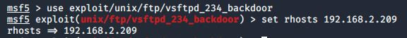 Use that exploit and set the rhosts parameter to the IP address of the Metasploitable machine, as shown in Figure 5.