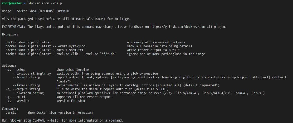 • To check all options related to docker sbom, type: