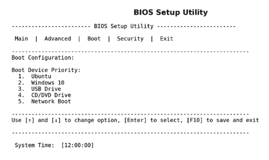 This window shows the priority for bootloader code known as ‘boot device’ priority. Here, Ubuntu is the first priority, which means on booting successfully the kernel of Ubuntu will be loaded by the bootloader directly. Emma can change the priority from her BIOS settings as and when she needs to change operating systems.