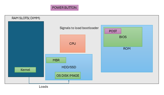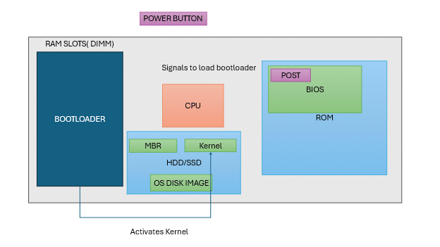 Similar to preheating the oven, the bootloader prepares the system for the OS. Once the POST sequence is successfully completed, the BIOS/UEFI firmware proceeds to load the master boot record (MBR), which contains information in the form of bytes located at the very beginning sector of a storage device such as HDD or SSD, into the RAM. The MBR contains the very first instruction called the bootloader and initialises the bootloader code to start things up. The bootloader’s primary task is to locate the kernel and hand over control, setting the stage for the operating system to take over.