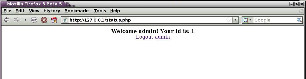 The status script can be accessed by clicking on the ‘Check Status’ link on the login page. It displays the user name and user ID obtained from the session data. This fulfills the basic requirement of a session, since it permits persistence of data across different pages after login.