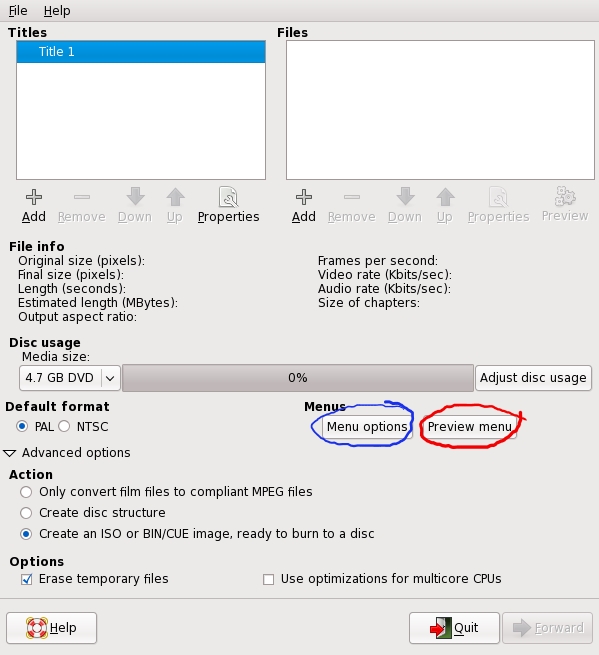 Once you are done allotting video files to all your titles, you are ready to create the DVD ISO. Click the Forward button in the window from Figure 1. You will be asked for a place to store the DVD image. Please heed the warning of not saving to a FAT32 partition. A FAT32 cannot store any file over 4 GB (a DVD image can be as large as 4.3 GB) and all kinds of horrible things will happen. (Lesson: Avoid anything even remotely connected to the Windows world :-))