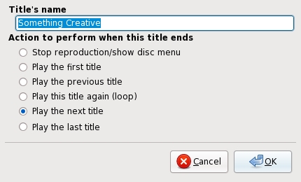 To change the default title names, select the title that you want to change and click on the Properties button. You will see Figure 2. Change the name to whatever you want to and associate an action with this title by selecting a corresponding option. For a really great touch, you can harness the power of GNU/Linux to write the titles in your mother tongue. I do my titling and credits in Bangla whenever I can.