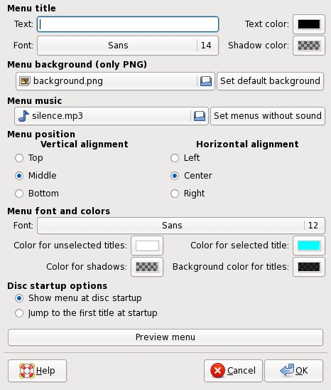 If you’ve done everything well till now, you should be in a position to create a DVD disc. By this I refer to the menus that you often see on DVDs with which you can navigate to see different features on the disc. You would want to have a DVD menu when you are burning more than one home video to a DVD disc, or if you have a particularly long video project (like a family marriage) and want to split it up into the various days it was spread over. Be warned however, that this splitting up would need to be done in Kino; that is, instead of exporting one large file depicting the entire event, you would need to export a few smaller files.