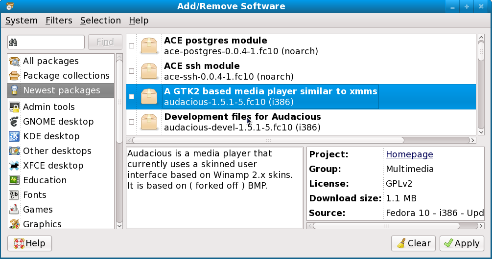 As you can see in Figure 1, there is a fairly standard hierarchical view of packages in a Fedora 10 software repository. You can install software as a collection that is quite useful if you want all the packages that form the new LXDE Desktop Environment in one go, for instance. The filtering capabilities are a bit unique. Let me explain that a bit more. You can filter the applications that are shown based on whether they are graphical or non-graphical, for development or regular use, have been installed or not installed, and also whether they are free and open source, or proprietary.