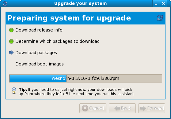 The upgrade process is managed by the native distribution tools. In Fedora, that’s PreUpgrade, which provides an online way to upgrade to a new release easily.