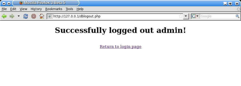 The session can be explicitly terminated by calling the dblogout.php URL, which sets the status to EXPIRED (or the numeric value 2). After the dblogout.php script is called, entering any protected page is not permitted. Figures 7 and 8 show the logout screen and the message displayed when calling dbloginstatus.php after completing the session. The dblogout.php script is listed below: