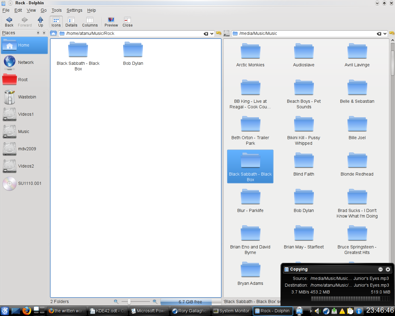 Dolphin does offer some advanced features too. One of my favourites is the ‘Split’ view option to divide the window into two parts—activate by F3 or View→Split. This option, as shown in Figure 8, comes in very handy when you want to copy/move files between two locations. Simply drag and drop the file/folder from one side to the other. By the way, the copying dialogue box has a nice notification window now, that pops out of the system tray, which even gives you the option to pause a transfer—much better than a separate floating window, I’d say. This dialogue box is not specific to Dolphin, but ubiquitous for copy/move/download/upload activities across all KDE apps.