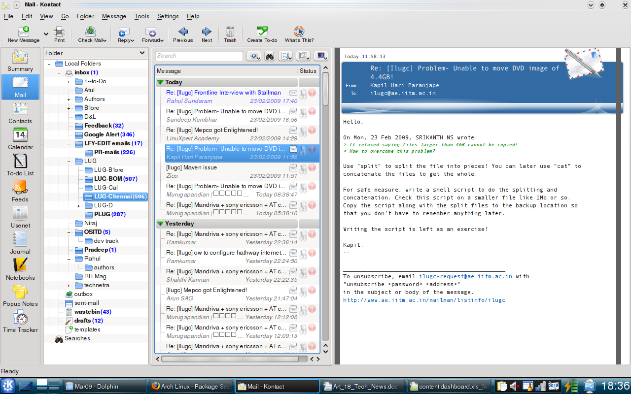 Kontact is something I depend a lot on at work. Apart from the Kmail client and an address book, it gives me an RSS feed reader, a to-do list, a calendar, time tracker, and something called pop-up notes. I absolutely love the addition of the ‘Fancy with Clickable Status’ theme in Kmail, which finally made me switch to a vertical message preview pane using a three-column layout in my wide screen laptop (Figure 9).
