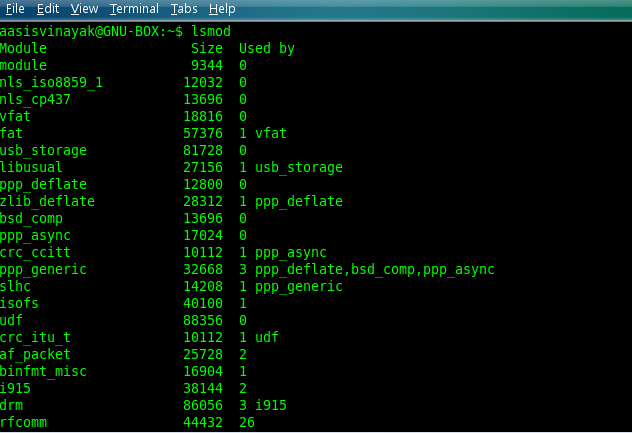 As I mentioned before, you can load a module by issuing commands. lsmod will list the modules (with a small description about its current usage) in your terminal. Figure 1 shows the result of the execution.