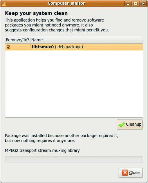 After a couple of days, I tried the Computer Janitor and it showed me a package that could be removed because it had once satisfied a dependency but was no longer needed now. The Janitor is good to have around to clean up the system if you want to, but it is not likely to be used too frequently since this is GNU/Linux, and especially since this is Debian (I usually remove packages completely, including configuration files, when I uninstall something on Debian).