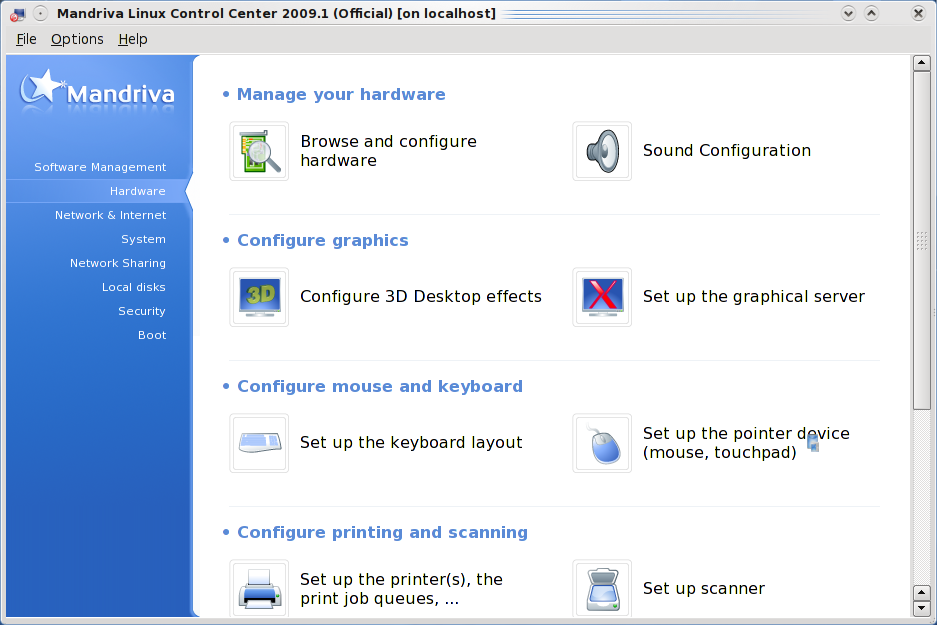 After the package installation was complete (throughout the progress one could choose to see a slideshow of Mandriva’s other products or read a text output showing each package’s install process), we were taken to the user configuration screen where we were asked for the root (administrator) password, and told to furnish the details of our user account. Here, there was no enforcement to furnish a password hint, and you could use a username other than your full name—two features absent in Windows and two features we really like. We were then asked where we’d like our bootloader to be installed—we chose the MBR of our first hard disk (the one with 320GB)—and then we were taken to the systems configuration screen where we could configure every aspect of the system prior to first boot.