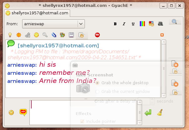 Now, enough history and politics. Coming back to GYachI—this IM client offers some cool features that are all missing in Pidgin and Kopete, which most of us use to talk to our Yahoo buddies. I wonder why the Pidgin and Kopete guys shy away from sharing photos… ;-)