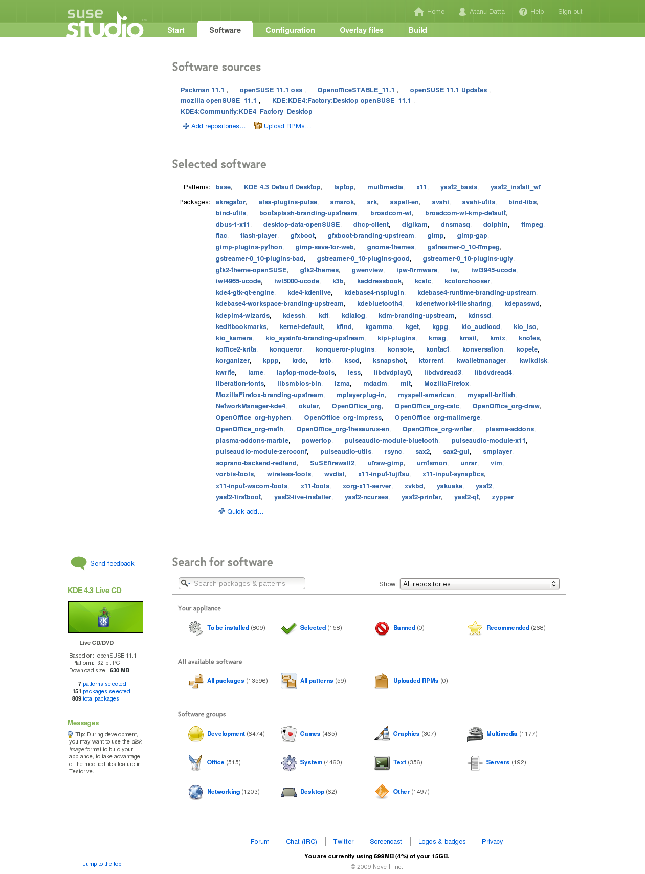 Another of my requirements was to build an ISO image and keep the size within 700 MB so that I could pack it in a CD. Upon selecting a package, the left-hand pane of the Web page live-updates the download size, number of packages and patterns, besides there being an Undo button (or Redo when you delete a package) to keep things under check. It also shows you a warning if the size of the overall image becomes more than 700 MB. This is important because the ‘Download size’ info box on the left-hand pane is that of the individual packages that have been selected. A live ISO will have certain other things that take up more space. What I figured was that I needed to stop adding packages the moment the download size reached 630 MB, because the process of ISO creation adds another 70 odd MB to the overall size.
