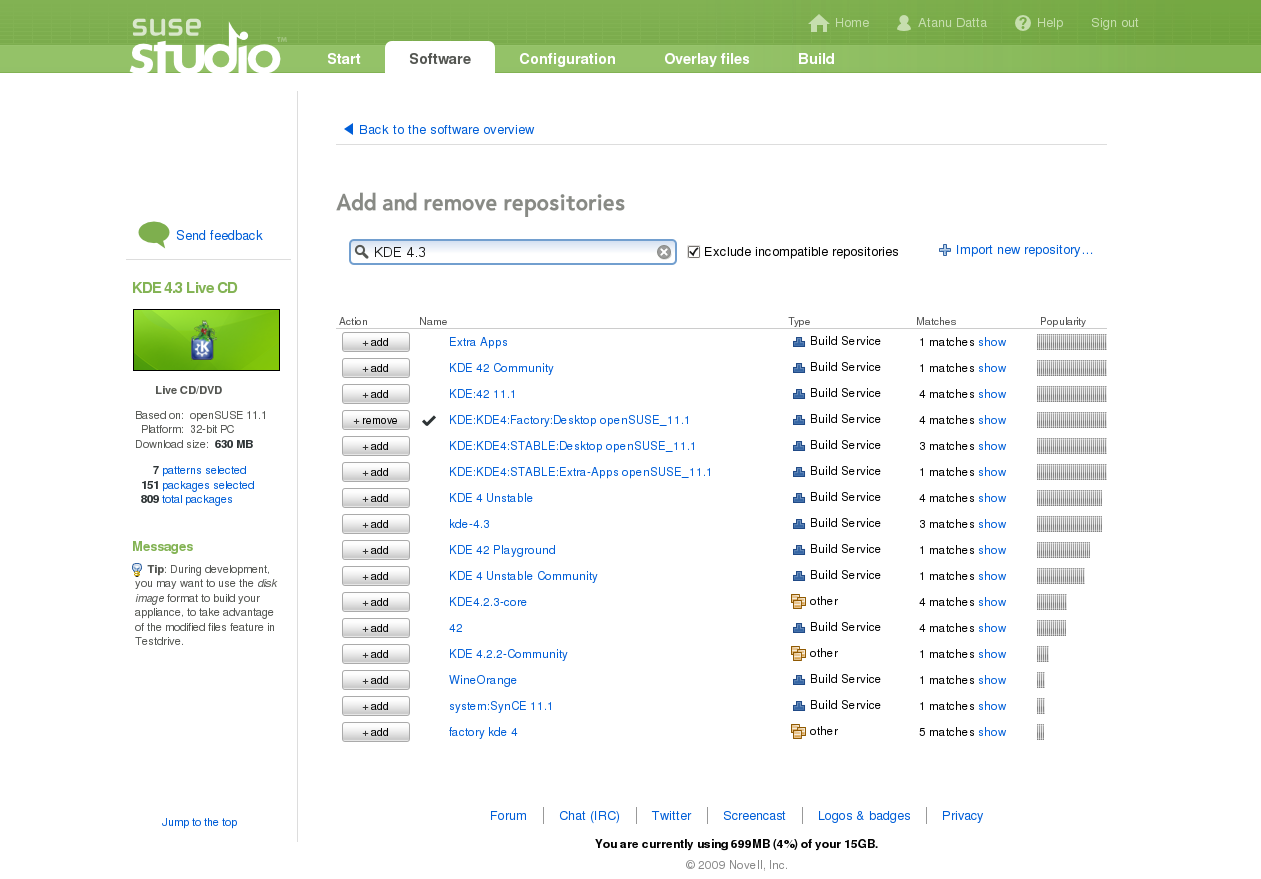 Under Sources, only openSUSE 11.1 and Updates repos are available, to start off with. The selected software shows the software that’s included, by default, based on the template you’ve started off with, and the Search section is where you’re to locate what all is available in the repos. It is all interactive. One good thing is that when you enter a search term (by package name or pattern) it lists what’s available, ranked by popularity. It lists the name of the application, its version, repository in which it is available, installed (not the download) size, and an action button to add (or remove already selected) applications.