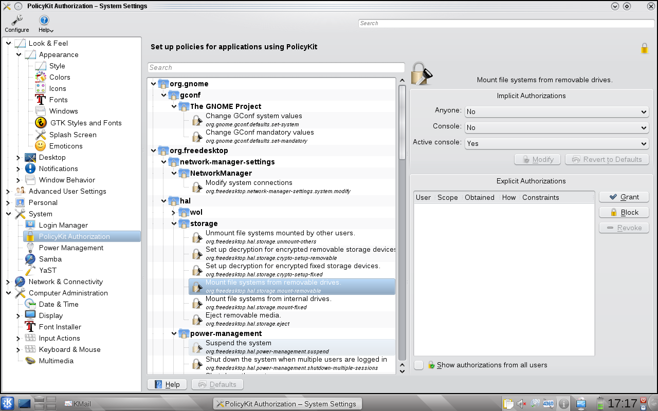Figure 7: System Settings using the Classic Tree View layout (see LHS pane); fine tuning PolicyKit settings (right)