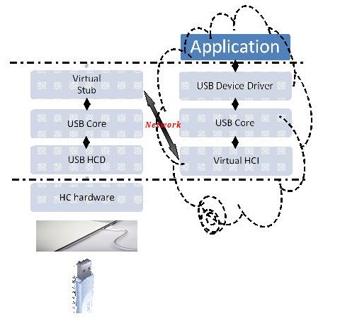 When our client desktop connects to a cloud server over the Internet, the device information and the data from the USB device has to be transferred through the network to a server on the remote cloud. This device information and data has to be tapped from the appropriate layer so that the virtual device can function properly. Figure 4 shows how the information could be tapped in a USB device.