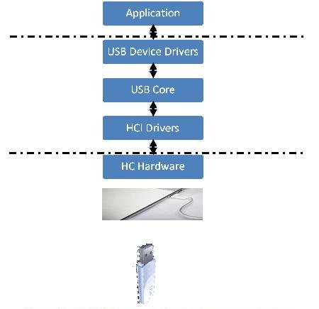 A Linux USB host driver consists of three major layers. The first low-level module is the Host Controller Driver (HCD), which implements hardware specific routines. The next portion is the USB Core Driver implementing USB-specific functions. The final layer is the application layer. Figure 3 illustrates the USB driver architecture.