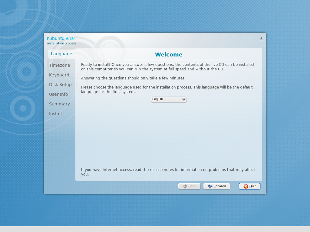 Kubuntu’s installer is another brilliant feature. A full screen image background modelled on the Air theme, with an installer wizard in the centre, guides you through the system installation.