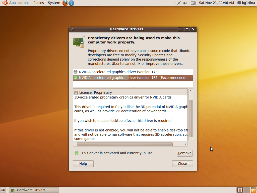 In (K)Ubuntu, the Jockey applet starts up on the first boot, showing a list of hardware that need proprietary drivers (it included only Nvidia G96 (9400GT) in my case)—refer to Figure 13. Select a driver version, hit ‘Activate’, and reboot. (You don’t really need to reboot; open a terminal, run sudo modprobe nvidia, log out and back in to X, and you are done.) Simple.