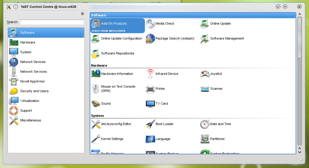 OpenSUSE, on the other hand, has YaST!, or Yet Another Setup Tool! (it has an exclamation mark at the end). As you can see in Figure 15, this one is also cleverly designed and a bit more powerful than MCC. However, this is at the cost of user friendliness.