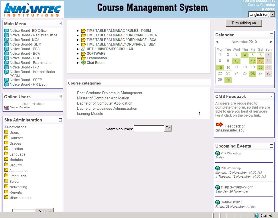 Moodle is, indeed, great software. If you are an academician who has faced the problems we did, this software will solve most of your issues, as outlined above. It works well with most databases and operating systems. I have personally tried it on Ubuntu 10.04, Windows 2003, and Win XP; believe me, it is fairly simple to get it working. We also customised the Moodle theme for our site, so as to be in sync with Inmantec’s website at inmantec.edu. There are also many books, videos and documentation on the Web about Moodle.
