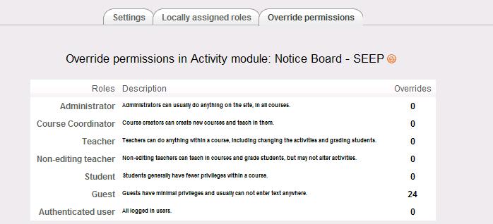 Not every student is tech-savvy, and there are some students and staff who are not able to learn the technology. We cannot deprive them of information, yet we still have to keep things secure. So we got the guest login feature in Moodle activated. We also changed the permissions set for those Moodle components that are to be hidden from guest users, and those to be visible to guest users. Figure 2 shows us the permissions. We can also change or amend permissions, as required, in the future.