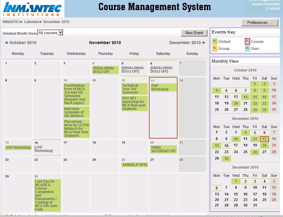 Moodle users, on logging in to the site, must be able to find upcoming events and new or updated content on notice boards, at a glance. For this, we use the calendar module in Moodle. Figure 1 displays Upcoming Events (RHS bottom), a component of Moodle. Figure 3 displays the calendar module.