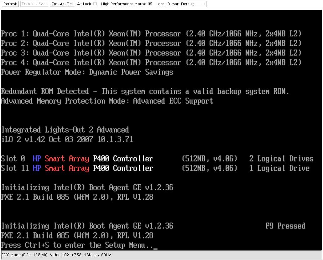 We connect the new mini_iso.isoas a virtual CD drive on the server, and in the iLO page’s Administration tab, click the Reset button. We switch to the virtual console and watch the system boot messages. As is visible in Figure 9, the system is intact, and boots as it should.