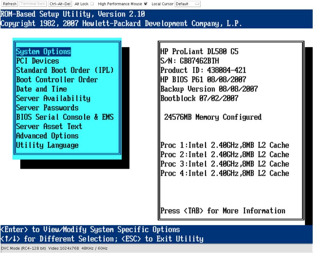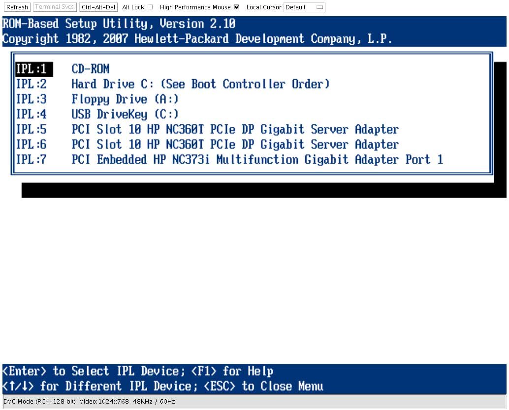 So we have access to the console as if we ourselves have a real keyboard and a screen. We can see the configuration of the RAID controller, and the server’s boot priority (the sequence of devices that the server checks in order to boot off — CD ROM, Ethernet card, or directly from HDD). In order to change it, you should press the F9 key right after the initialisation of both RAID controllers (they’re named HP Smart Array P400 Controller). After you press the F9 key, you’re in the Setup Utility (Figure 4).