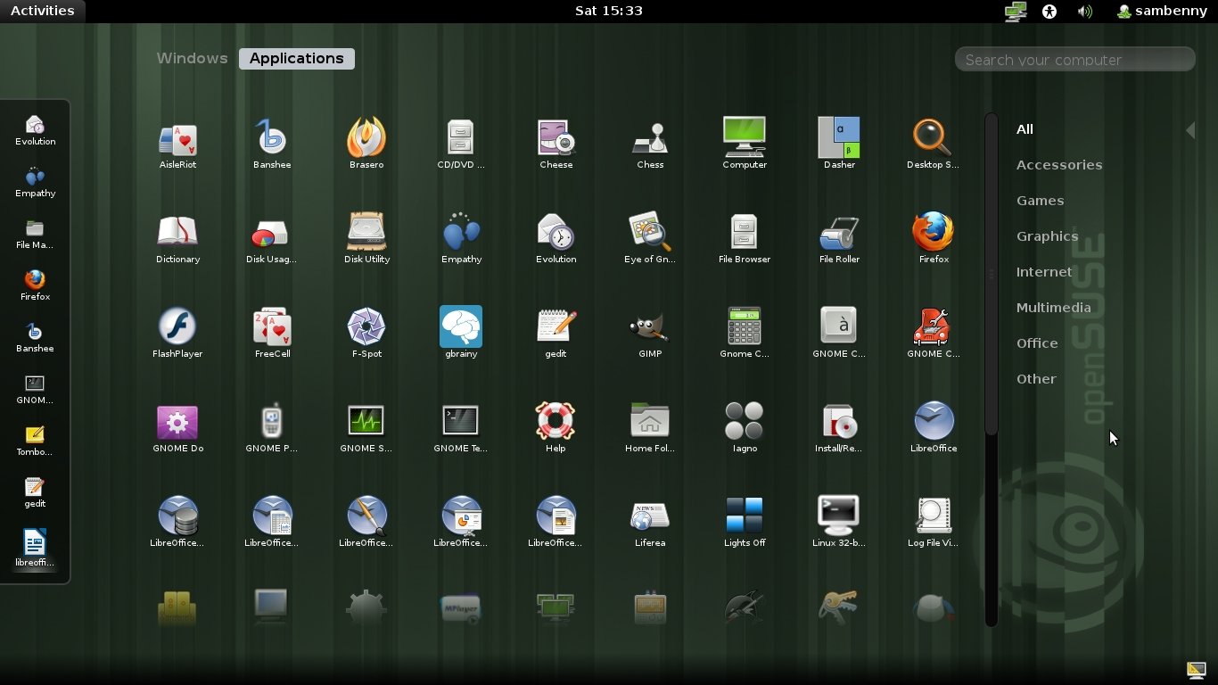 The Applications tab is where you can find your desired apps. It initially displays all the apps, but the category list is located on the right. There is a search bar included above the category list, where you can type the name of the app or file that you are looking for. However, the search bar failed to work in the GNOME 3 preview. The shell displays error messages and status messages in a pop-up screen, which does not interfere with the application that you are currently using.