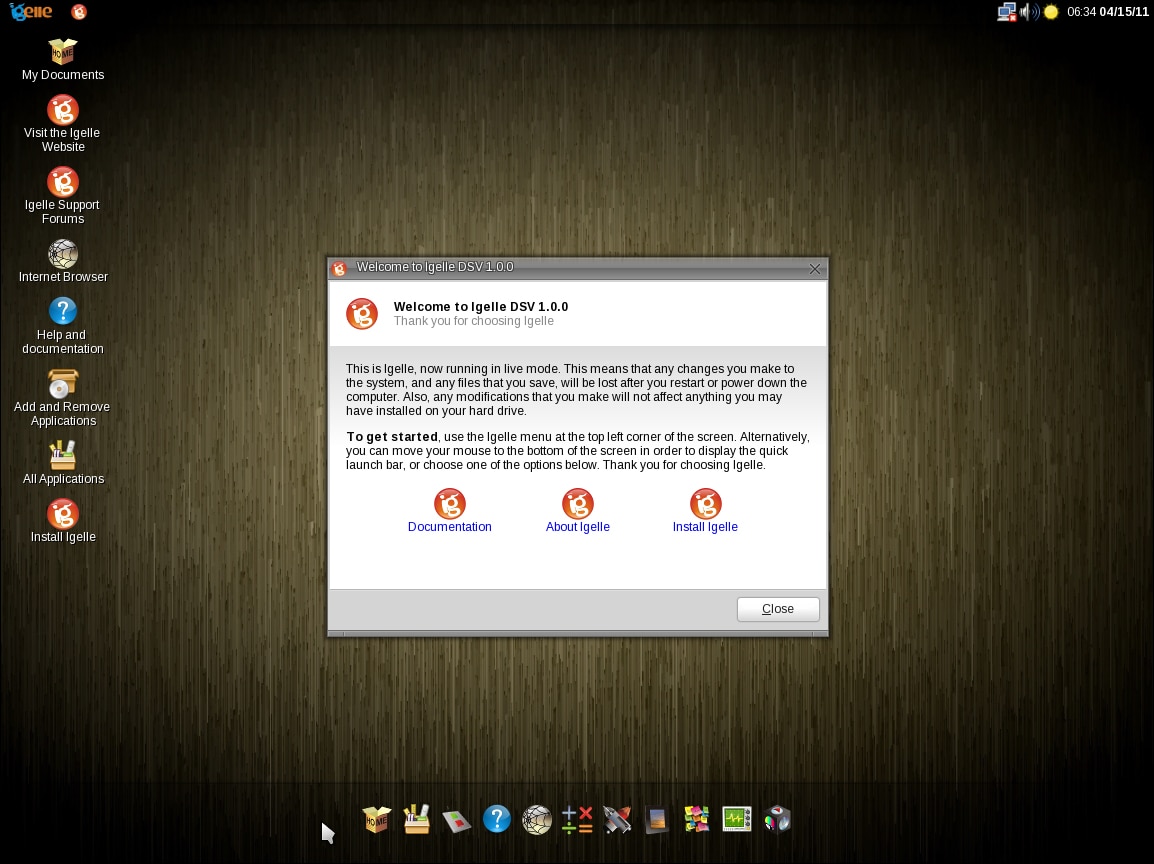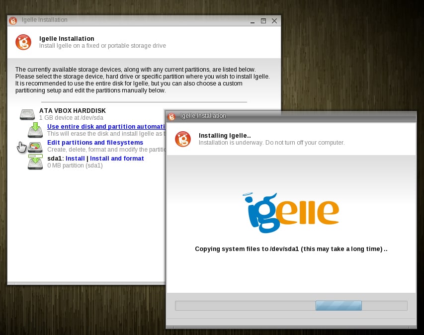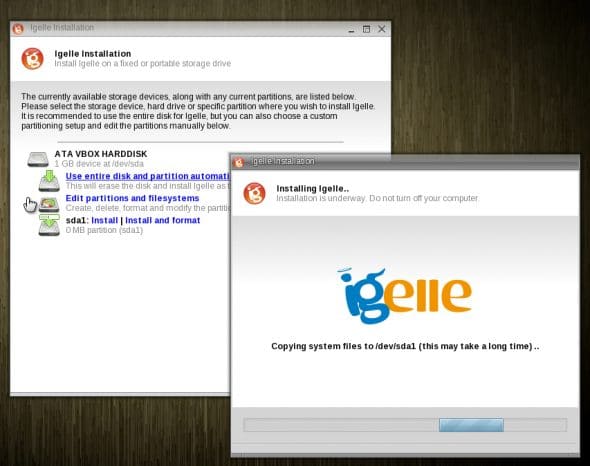 Igelle’s overlay mechanism lets you have a single distributed, basically packaged and unmodified ISO file, with transparently mounted software “upgrades”. Igelle can be installed on a freshly reformatted media, or a single ISO file can be placed on an existing filesystem. The overlay concept allows for two booting modes: the normal and “live” mode. The latter helps restore systems from an inconsistent/damaged state. This concept also allows users to access/keep personal data on already existing partitions — again, the maximum flexibility.
