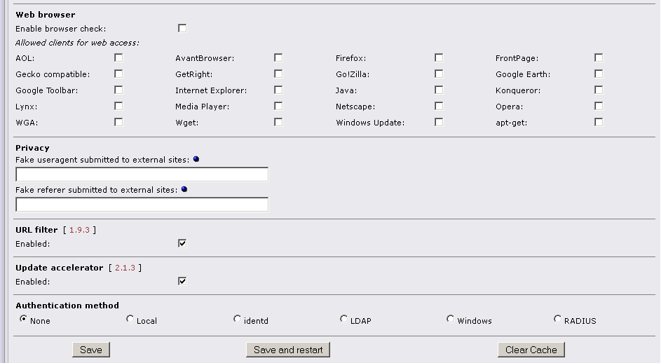 - Whether or not to use Transparent mode (no change in client browser connection settings is required, though the browser must be configured to use the IPCop proxy port).