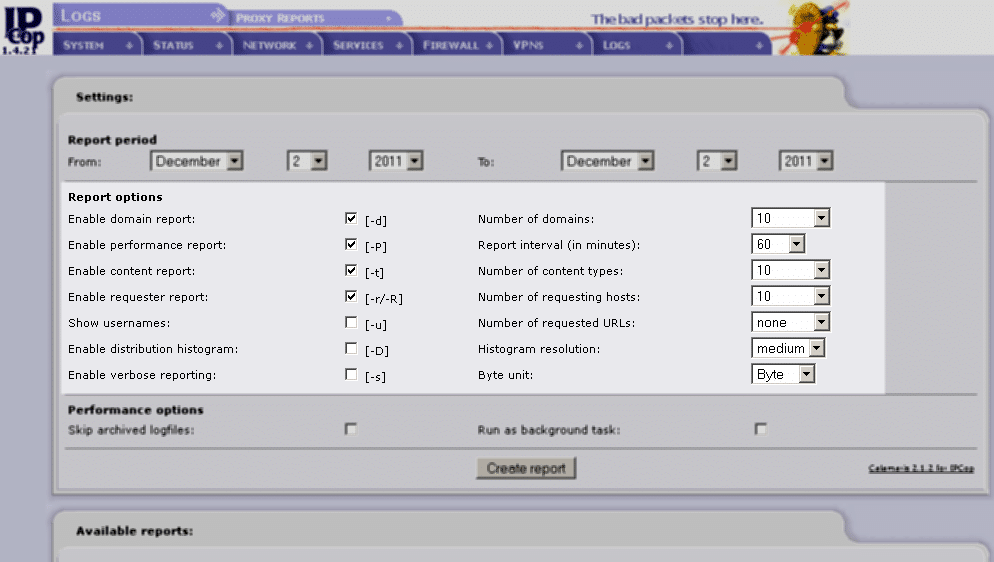 This add-on requires no configuration. Go to Logs –> Proxy Reportsto access the report generator. Calamaris can generate reports based on parameters like Domain, Performance, Contents, Requester, etc. The time needed for report generation may vary based upon the CPU, hard disk and log size. Reports can be viewed on-screen or exported to text files (see Figures 3 and 4).
