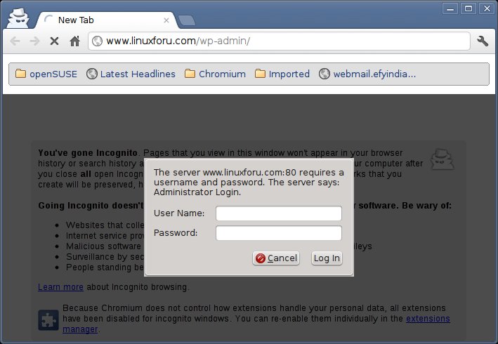 location /wp-admin { auth_basic “Administrator Login”; auth_basic_user_file /srv/www/opensourceforu.com/.htpasswd; }