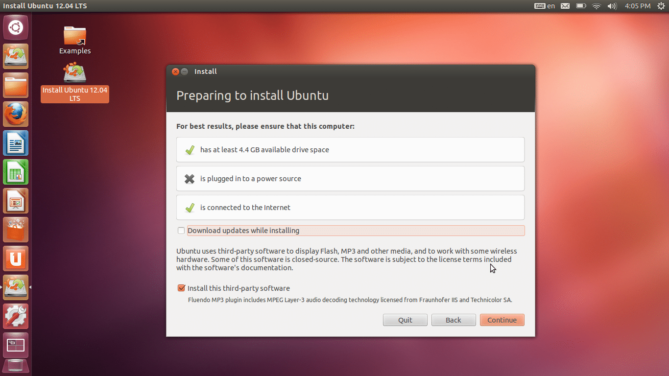Installing proprietary codecs come with its own set of quirks — but let’s not get into that. A point to note: you can easily install FOSS libraries to get the same functionality later. Canonical can’t ship with these libraries due to software patent restrictions at some parts of the world. Unfortunately, most users blame the absence of codecs to “Linux”, and this install-third-party-(licensed)-codecs option has been a nice add-on by Team Ubuntu since a few releases that let’s you have a working system from go-live with MP3, and somehow even Flash support!