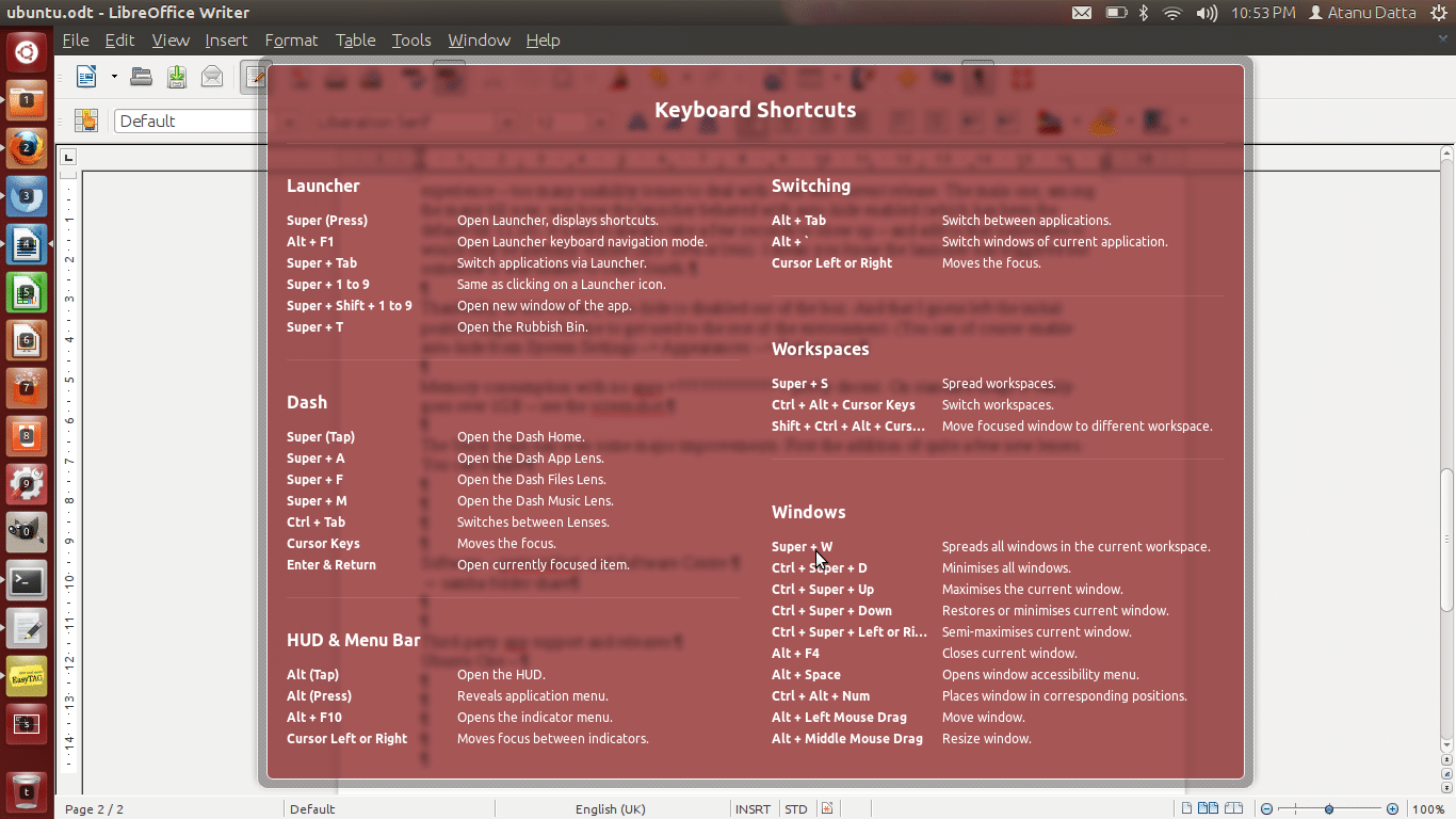 The Unity Dash has seen some subtle improvements. You can trigger it by clicking the Ubuntu button on the launcher, or pressing the super key (MS Winduhs key). In fact, a real nice addition is the Keyboard Shortcuts reference overlay (see screenshot) — trigger it by pressing and holding the super key for a couple of seconds — which helps you quickly look up associated Unity-related actions and triggers. My favourite is Super + W to get a bird’s eye view of all the apps I’m currently running.
