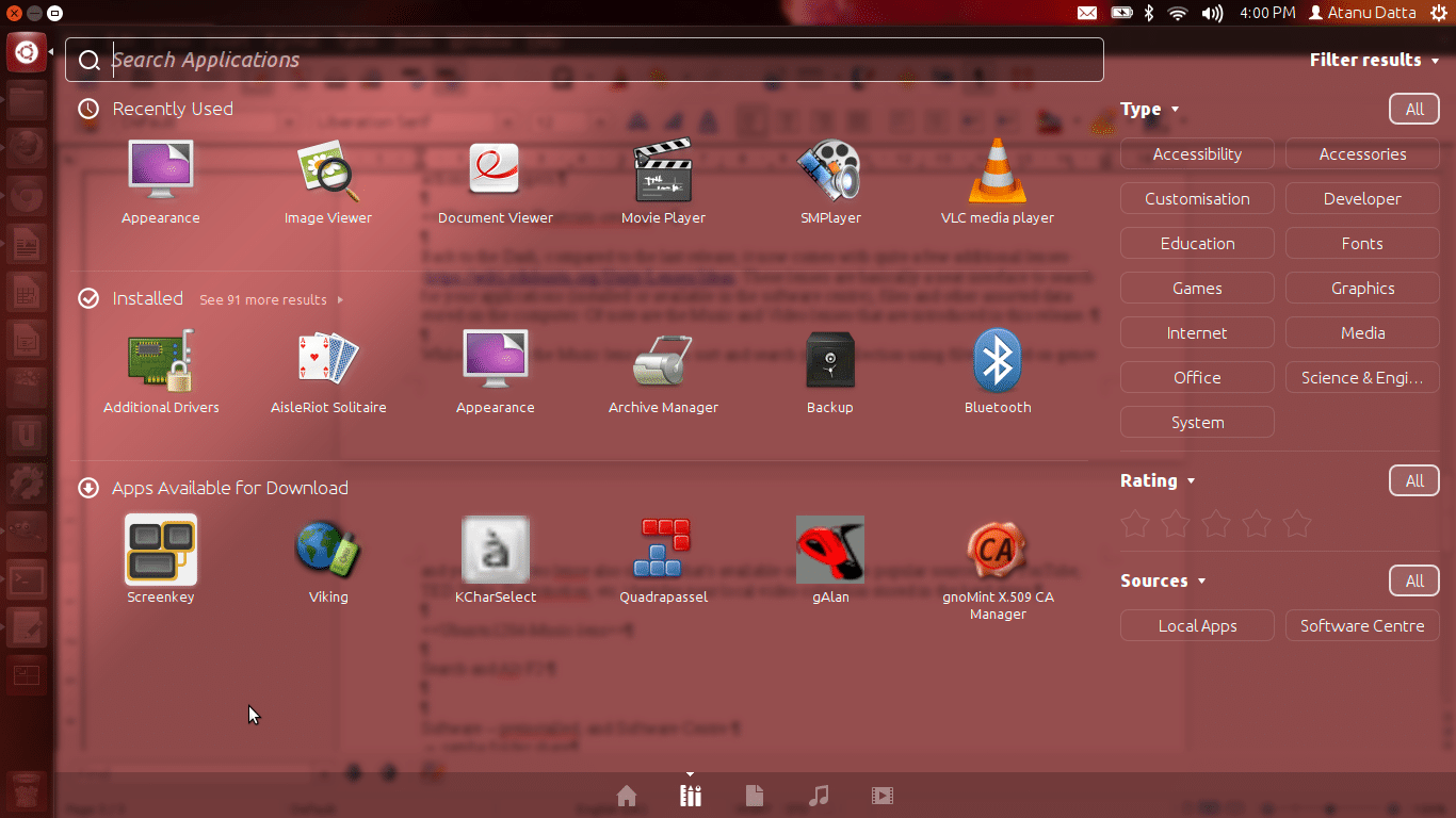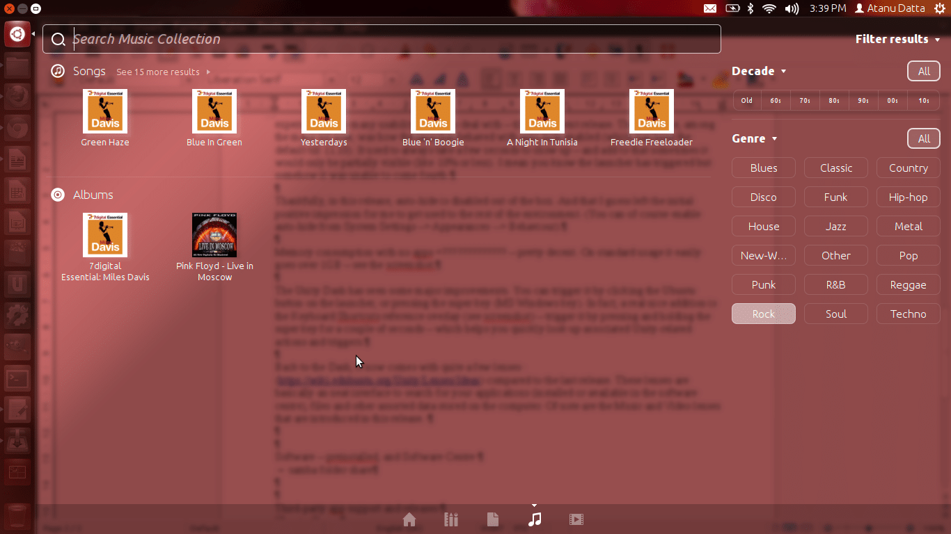 Back to the Dash, compared to the last release, it now comes with quite a few additional lenses. These lenses are basically a neat interface to search for your applications (installed on your system or available in Software Centre), files and other assorted data stored on the computer. Of note are the Music and Video lenses that are introduced in this release.