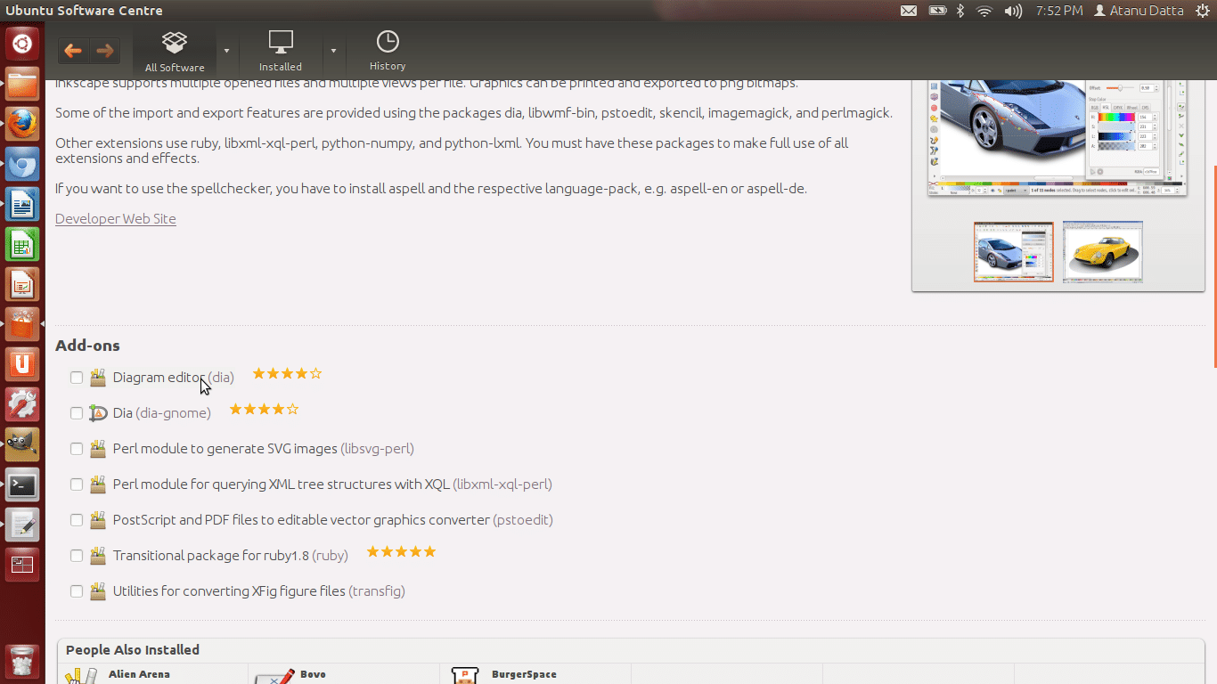 Another thing I have beef with is this: although while checking out an application before installation (for details, ratings, reviews, etc.) it lists certain add-ons that can come in handy, there is no way to check the detailed description of these add-ons without searching for them individually. Refer to the screenshot below — a user might not know what Dia is (why is Dia listed twice, by the way), and even if he does, he might not be sure how would Dia serve as an add-on for Inkscape.