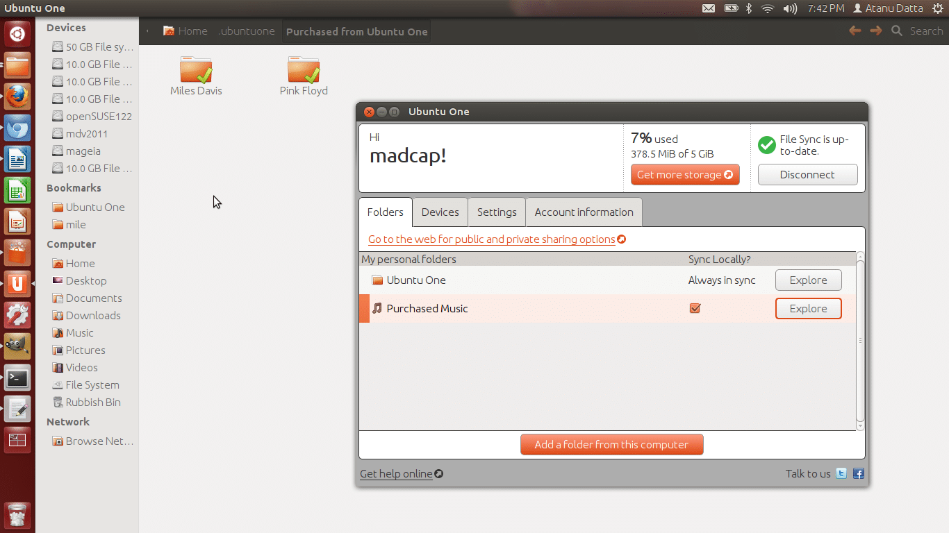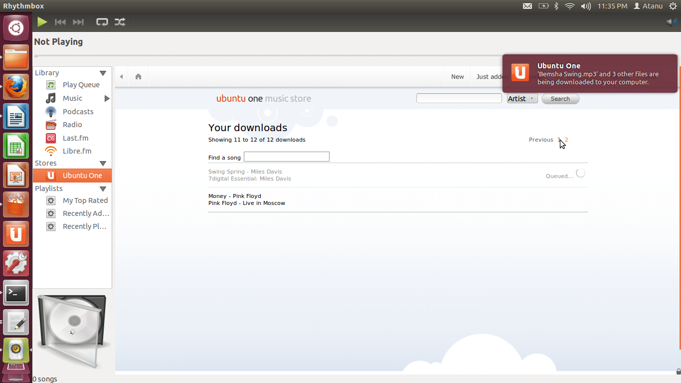 The experience of buying music from Rhythmbox is neat and very well integrated. I ended up buying a collection of Miles Davis (20 songs for $1.99 — nice deal, eh?) to test the seamlessness of the experience. The files once bought, are first transferred from the 7Digital store to the Ubuntu One cloud account, and soon available on my Rhythombox library. The only grudge? I found the version of Rhythmbox that comes with Ubuntu rather unstable, as it likes to crash on me every now and then.