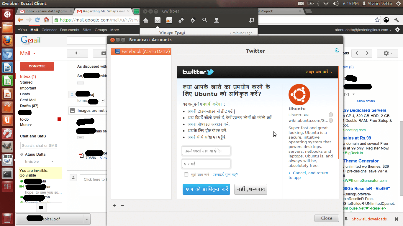 P.S. → Forgot to report another bug; although I’m not sure how many people actually use the messaging menu, especially the Gwibber app. When I tried to authenticate Facebook, I got the correct English (my preferred desktop language) login authorisation page. Somehow Twitter authorisation pulled up a Hindi page — and I confess being a Bengali, and having only learned Hindi as a subject till eighth grade, I had a hard deciphering this: