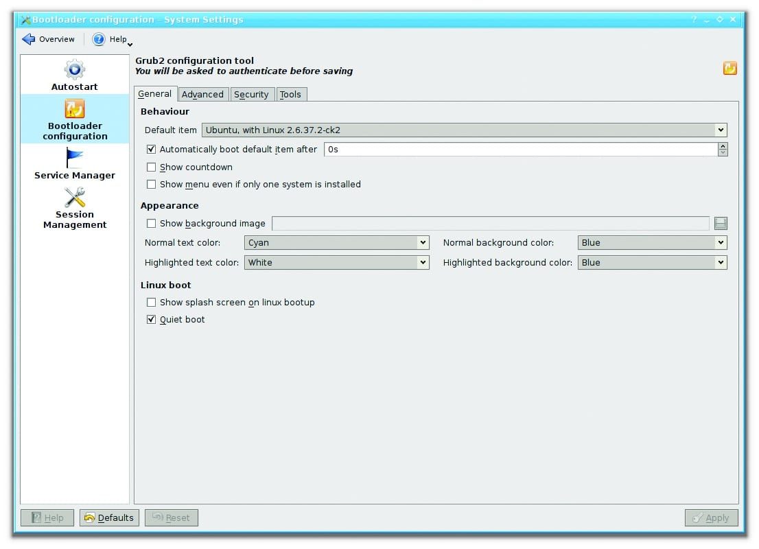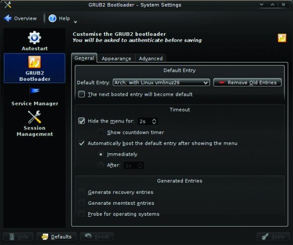Grub2 KCM: Another KDE system settings add-on, Grub2 KCM offers a stripped down set-up wizard. Though not as fancy as the bootloader editor, Grub2 KCM allows you to manage and update basic functionality.