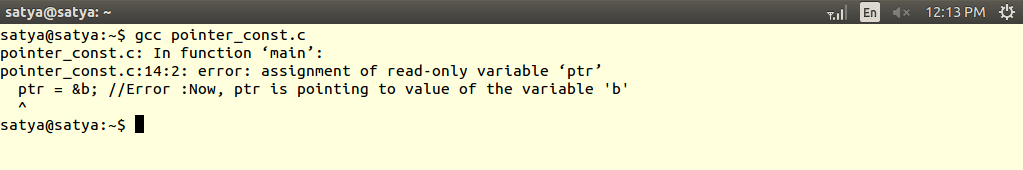 In the above code, in Line No. 11, we are trying to change the value of the variable to which the pointer is pointing to, but this is not possible since the value is constant. When the above code is compiled and run, we get the output shown in Figure 1.