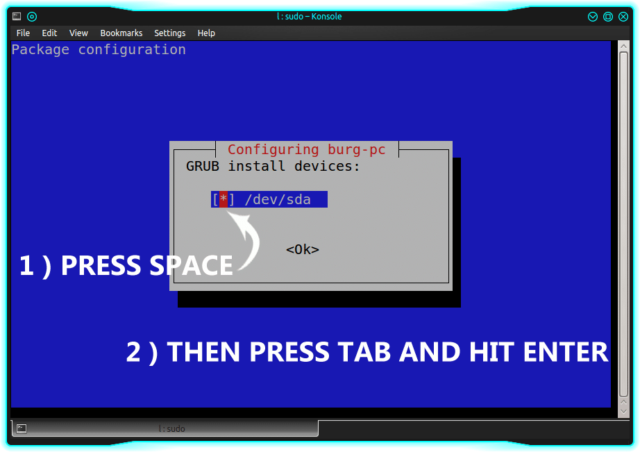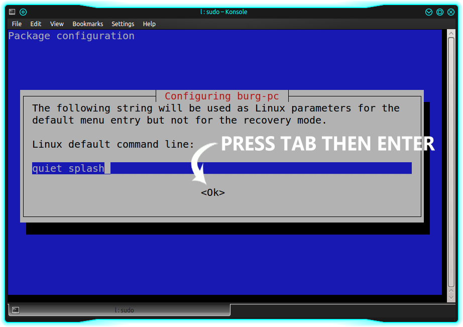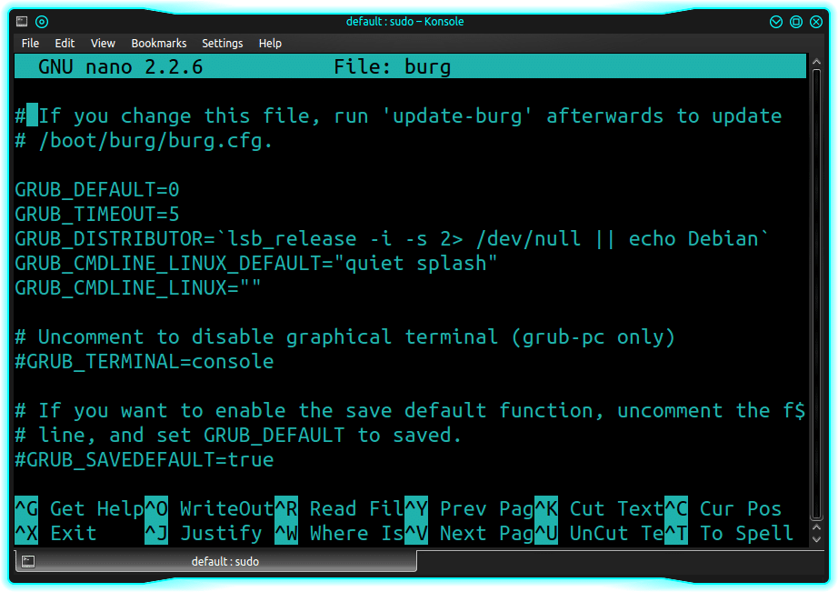 sudo burg-emu Press F1 Help F2 Change Theme F3 Change Resolution Arrow-keys to move.