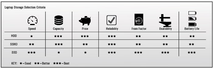 An SSD is approximately 100 times faster than an HDD, making it a primary choice if you are looking for high speed accesses to all your data. It will enable your laptop to be very thin, light and would drain your battery to a much lesser extent. But then this would make the price higher and higher, as you seek more and more drive space. SSDs are typically suitable for business application laptops that need not store much (< 500 GB) but need to be extremely light, portable, and boot and perform very fast.