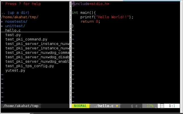 This gives the current directory window. NERDTree shows the current files in the Documents directory (Figure 1). You can shift between the tree and file using the Ctrl+ww keys.