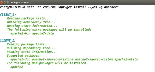 Let us look at the case when the administrator has to install Apache2 in all the client machines. This can be completed by executing a single command on the Salt Master as shown in Figure 6, where we can also see the responses from all the client machines.